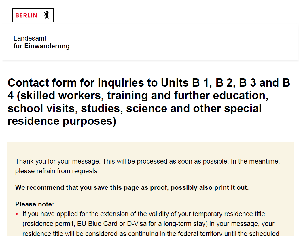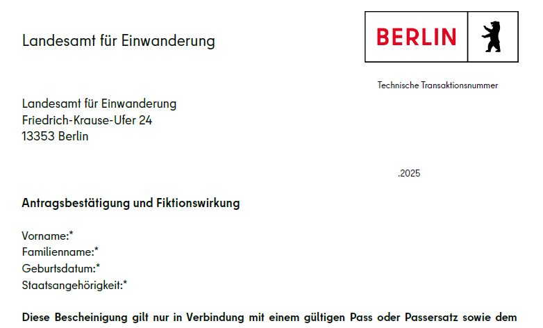 بهذا التأكيد يظل تصريح إقامتك ساريًا طالما تم تقديم الطلب في الوقت المناسب. ويُقصد بذلك أن يتم تقديمه في موعد أقصاه اليوم الأخير من صلاحية تصريح الإقامة الحالي. ويُعد هذا التأكيد بمثابة وثيقة الاستمرار القانوني للإقامة (Fiktionsbescheinigung). كما تبقى اللوائح الإضافية المرتبطة بإقامتك (مثل ما إذا كان يُسمح لك بالعمل وأين) سارية كذلك. وينطبق ذلك على جميع أنواع تصاريح الإقامة .